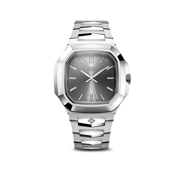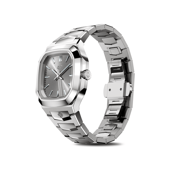 Desert Silver introduces a darker, more atmospheric take on the classic silver dial. With a warm grey tone and sun-ray brushed finish, it reveals subtle gradients that shift between shadow and sheen. The result is a sophisticated dial that carries both depth and restraint, complementing the architectural lines of the case. The GC FlexLink™ bracelet completes the piece, crafted in stainless steel with alternating brushed and polished facets that elevate the watch's presence on the wrist.